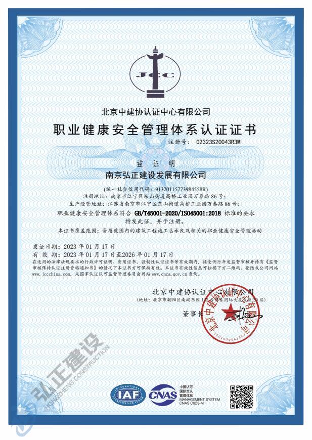 职业健康安全管理体系认证证书